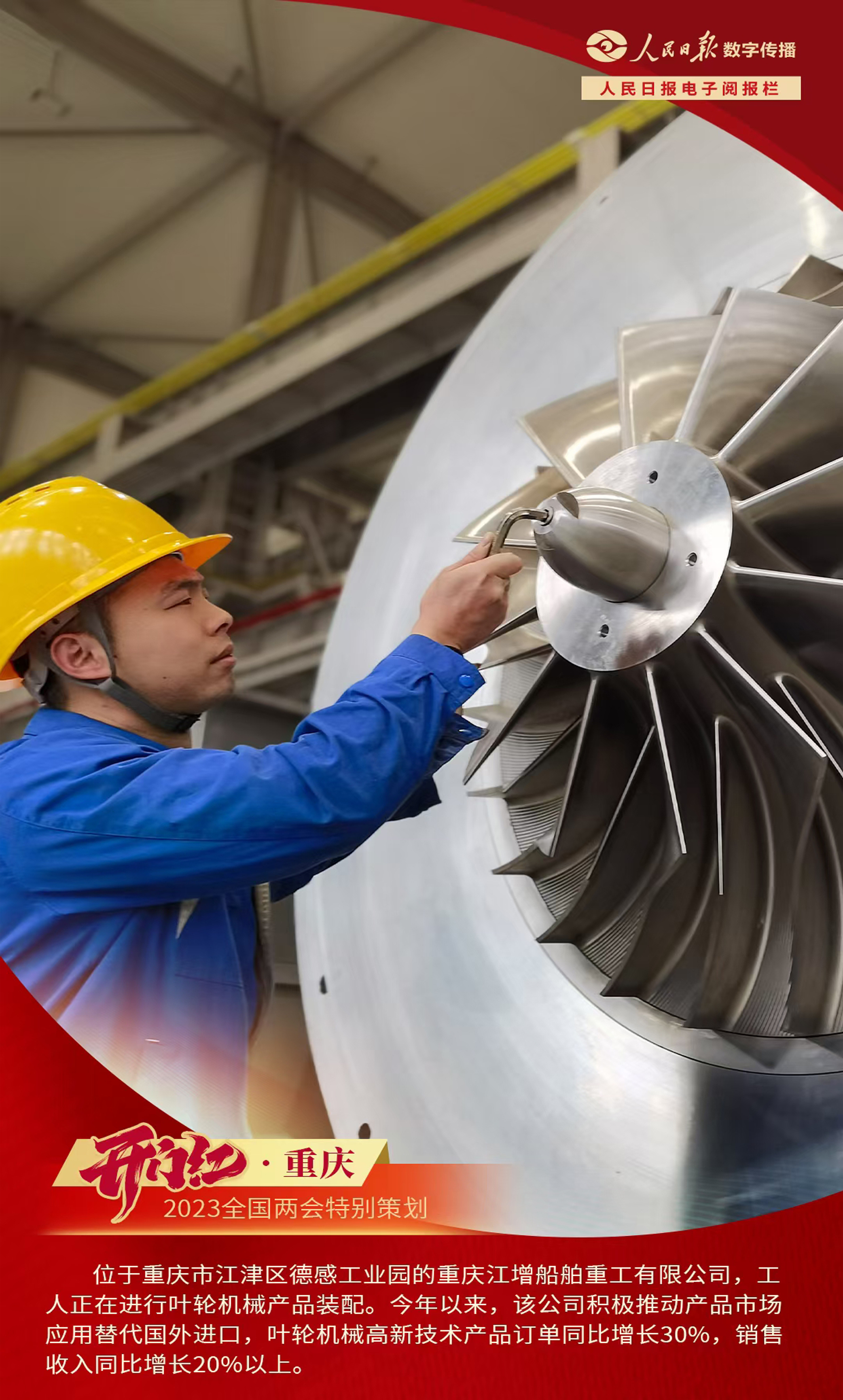 ????全國兩會期間,《人民日報》在開辟的2023年全國兩會特別策劃開門紅?重慶篇專欄中,對江增重工進行了圖文報道,內容:位于重慶市江津區德感工業園區的重慶江增船舶重工有限公司,工人正在進行葉輪機械產品裝配。今年以來,該公司積極推動產品市場應用替代國外進口,葉輪機械高新技術產品訂單同比增長30%,銷售收入同比增長20%以上。